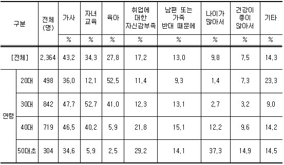 한국여성정책연구원과 한국노동연구원에서는 실시한 ‘경력단절여성등의 경제활동촉진 기본계획 수립을 위한 기초 조사’ 자료 첨부합니다. 참고하세요.
