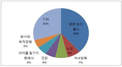 경력단절여성의 퇴직 사유를 보면 결혼, 임신, 출산에 의한 경우가 가장 많고, 수입, 자녀양육의 문제 때문에 퇴직하는 경우가 뒤를 이었습니다. 경력단절여성의 구직활동저해요인으로도 가사. 자녀교육, 육아 등의 문제가 가장 컸습니다.