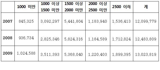 배기량이 1000cc가 안되는 차는 대부분 경차일텐데요. 경차의 등록수가 상당히 늘어났다는 것을 볼 수 있습니다. 이는 고유가시대이기도 하고, 경차를 위한 각종 혜택때문인 것 같습니다.