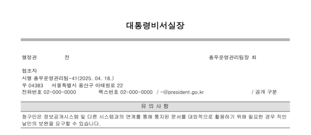 문제는 시민들이 대통령비서실의 정보은폐에 대해 문의조차 할 수 없도록 담당 공무원의 이름도, 전화번호도 가렸다는 것이다. 대통령비서실은 불과 몇 달 전에 대법원 판결을 통해 대통령실 직원명단은 비공개할 수 없다는 처분을 받기도 했지만 이를 무시하고, 일반적인 문서에 기본적으로 적혀있는 담당 공무원의 이름을 ‘행정관 전OO, 총무운영관리팀장 최OO’ 으로 가렸다. 전화번호마저 실제 있지도 않은 02-000-0000으로 통지해 버렸다.