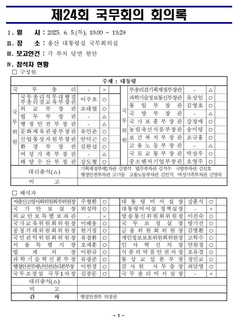 국무회의 규정에 따르면, 국무회의는 국가의 중요 정책이 전 정부적 차원에서 충분히 심의될 수 있도록 운영해야 한다. 행정부의 최고 결정 기구인 만큼, 이 회의에서 어떤 안건이 다루어지고 누가 어떤 의견을 냈는지는 우리 사회의 구성원 모두에게 매우 중요한 영향을 미치기 때문이다.