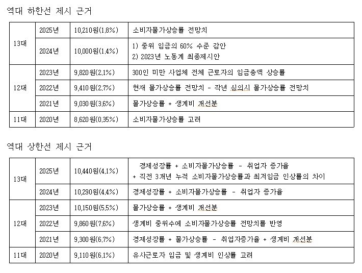 상하한선을 정하는 기준은 일관적이지도 않다. 최저임금위 발표 자료를 토대로 역대 근거를 살펴보면 적용하는 수치나 산식이 그때그때 다르다는 것을 알 수 있다. 문재인 정부 때인 2021년에는 ‘물가상승률+생계비 개선분’이 하한선의 기준이 되었지만, 윤석열 정부가 들어선 2023년에는 같은 산식이 상한선의 기준이 된다.