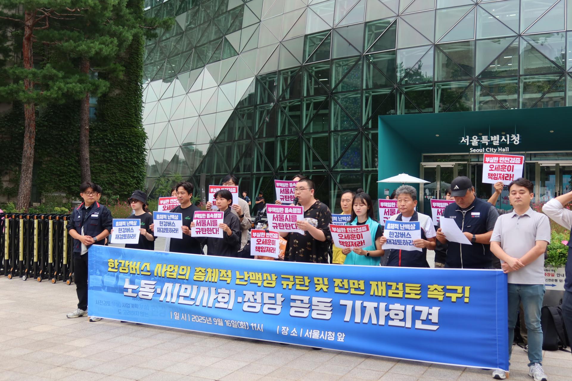 오늘 우리는, 서울시 대중교통 정책 실패의 역사를 반복하며 시민의 기대를 배반한 한강버스 사업의 전면 중단을 촉구하기 위해 이 자리에 섰다.
