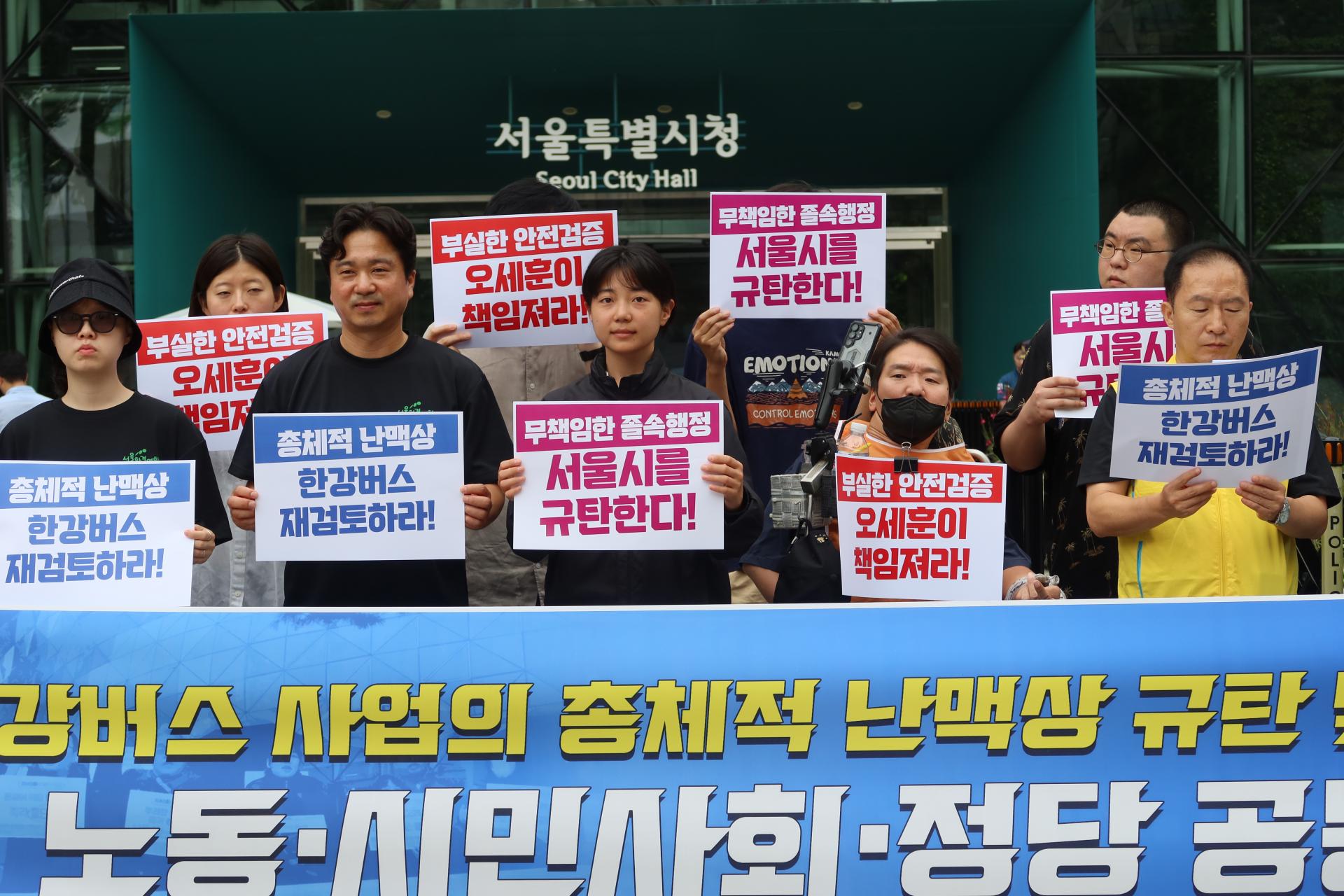 ◌ 김호정 민주노총 서울본부 사무처장은 “한강 버스는 과거 수천억을 낭비하고 실패한 ‘한강 르네상스’ 사업의 재판이며, 시민의 세금을 엉뚱한 데 쏟아붓는 예산 낭비”라고 목소리를 높였다. 그는 “선박 건조 경험도 없는 신생 업체에 수백억 원의 선금을 지급한 과정은 명백한 특혜 의혹”이라며, 대중교통의 기본조차 갖추지 못한 이 사업의 전면 재검토와 불법 특혜 의혹에 대한 철저한 조사를 요구했다.