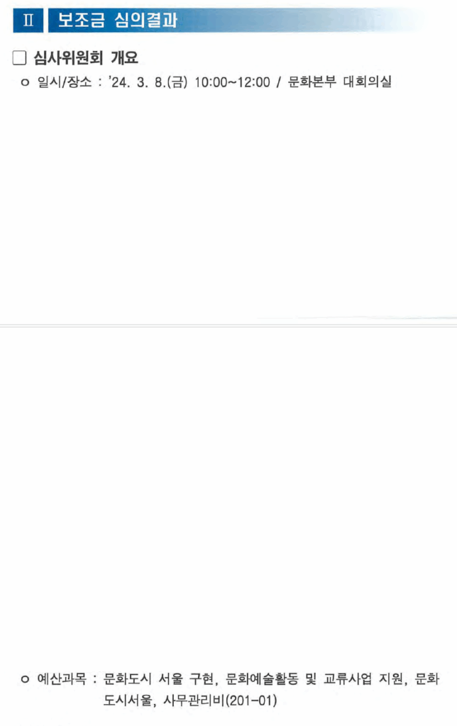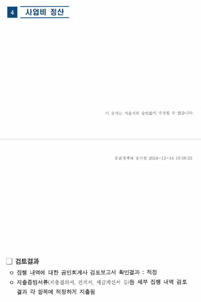 그간 어떤 단체에서 어떤 행사들이 진행되었나 궁금해져 2019년부터 2024년까지의 공고문, 심사결과 보고서, 결과보고서를 서울시에 정보공개청구하였습니다. 그렇게 우여곡절 끝에 받아본 문서들, 공고문만큼은 원본 그대로였지만, 심사결과 보고서와 결과보고서는 군데군데 내용이 홀연히 사라진 채였습니다.