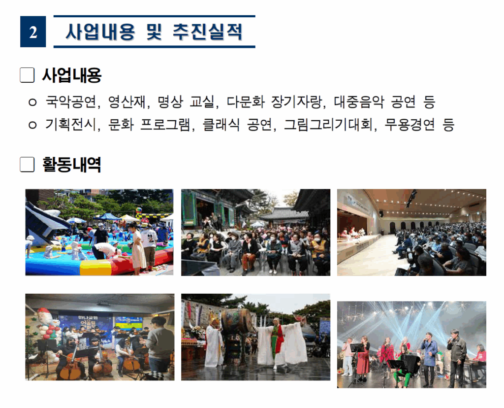 이렇게 받게 된 결과보고서 사업내용에는 주관 단체명도, 행사 일시와 장소도, 하물며 행사명도 없이 “국악공연, 영산재, 명상 교실, 다문화 장기자랑, 대중음악 공연 등”과 “기획전시, 문화 프로그램, 클래식 공연, 그림그리기대회, 무용경연 등”으로 뭉뚱그려져 있었습니다.