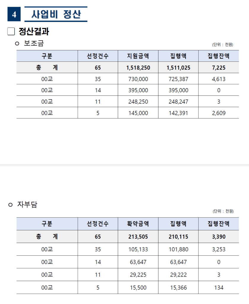 편의상 A, B, C, D교로 구분하자면 A교는 평균적으로 약 2,085만 원, B교는 약 2,821만 원, C교는 약 2,256만 원, D교는 약 2,900만 원을 보조금으로 지원받았네요. D교와 A교 평균 보조금 사이에는 815만 원의 차이가 있는 걸 이 표 덕분에 알 수 있었습니다.