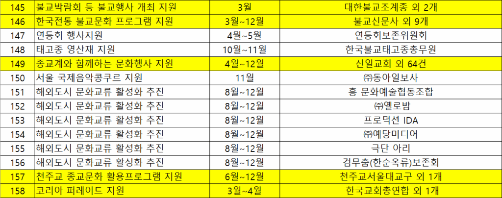 이에 종교단체들의 접수 현황 및 종교단체들의 선정 결과 등은 종교단체라는 특수성을 고려하여 공개 시 발생할 수 있는 종교 편향에 대한 오해 및 갈등의 심화 가능성 등을 배제할 수 없기 때문에 헌법 제20조 제1항, 제2항, 정보공개법 제9조 제1항 제7호에 의해 비공개 결정하였습니다.