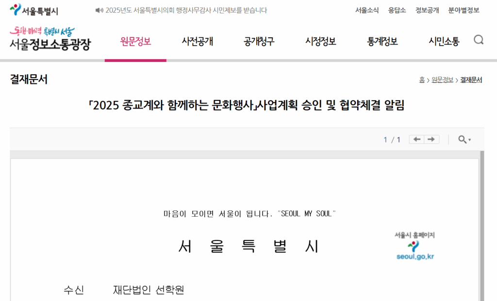 서울시는 2019년부터 ‘종교단체 지원사업’을 진행하고 있습니다. 2023년부터는 ‘종교계 주최 시민참여 행사 지원사업’으로, 2025년에는 ‘종교계와 함께하는 문화행사 지원사업’으로 이름이 바뀌었는데요. 올해로 7년째를 맞이한 이 사업, 정확히 무슨 행사를 지원하는 걸까요? 공고문에 따르면 ‘서울시의 주요 정책 목표 홍보’에 기여할 수 있는 행사나, ‘계승·발전이 필요한 종교계 문화예술 행사’를 지원하는 행사인데요. 뉴스를 찾아보니 올해도 봉은사에서 주최하는 ‘불교 차 문화 축제’나 CCM교회에서 주최하는 ‘다문화 공동체와 함께하는 가을밤 콘서트: 사랑의 하모니’ 같은 행사가 있었습니다.