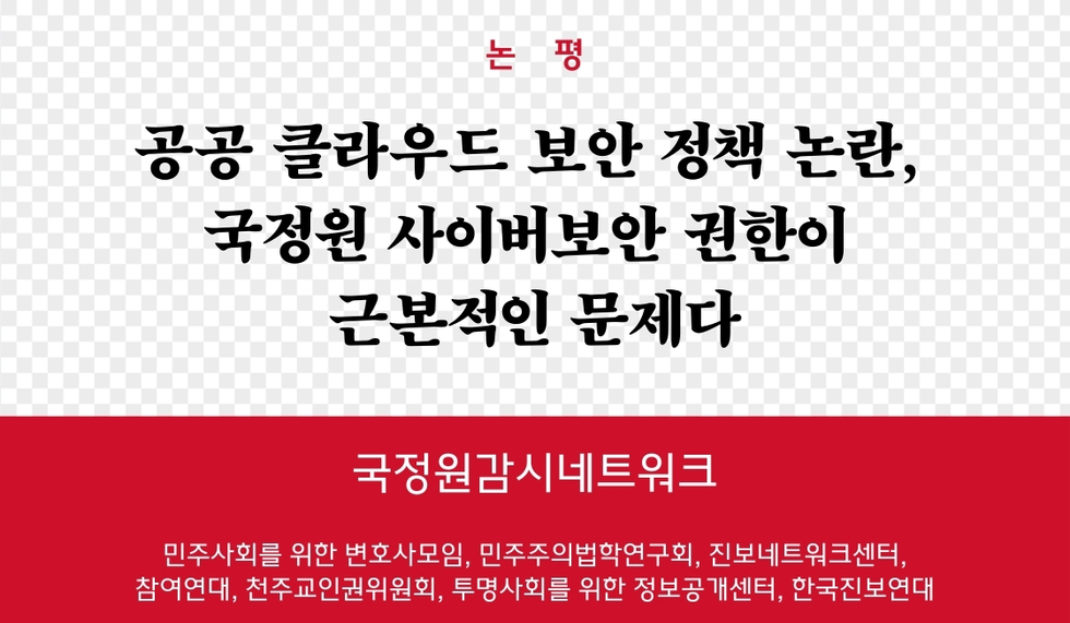 따라서 국정원이 공공 클라우드의 보안 인증을 일원화하여 담당하는 것은 문제가 있을 뿐만 아니라, 나아가 국정원의 사이버보안 권한 자체를 폐지할 것을 요구한다. 최근 AI 기본법이 제정되었지만, 국방부 조차도 국방 AI 기본법을 만들겠다고 하는데, 국정원은 AI 기본법의 적용 대상에서 제외된 것만 보더라도, 한국 사회에서 국정원에 대한 민주적 통제는 여전히 한계가 있음을 알 수 있다. 이재명 정부에서 권력 기관의 민주적 통제를 제도화하고 헌정 질서를 회복하려는 다양한 노력이 이루어지고 있지만 국정원 개혁은 언급조차 되지 않고 있다. AI 기술의 발전에 따라 권력 기관의 감시 역량이 더욱 확대될 가능성이 크다는 점을 고려할 때, 국정원 개혁은 더이상 늦출 수 없는 과제이다. 국정원의 정보기관으로서 제 역할에 집중하고 민주적인 사이버보안 거버넌스가 이루어지는 방향으로 국정원을 개혁할 것을 촉구한다. 끝.