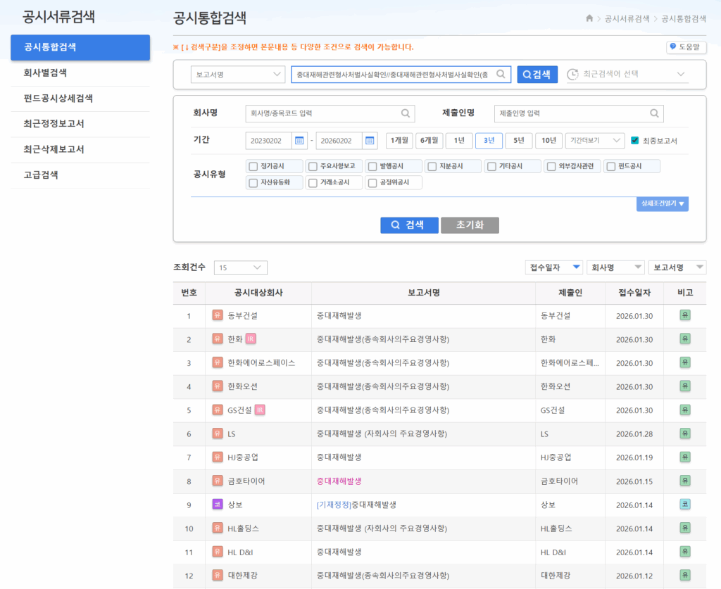 DART 공시통합검색에서 ‘보고서명’으로 검색 구분을 선택한 뒤 중대재해를 입력하고 관련 공시항목을 모두 선택하면 최근 공시된 상장회사의 중대재해 내역과 보고서를 볼 수 있다. 고급 검색 메뉴에서 ‘중대재해’를 직접 입력해 검색하는 방법도 있다.