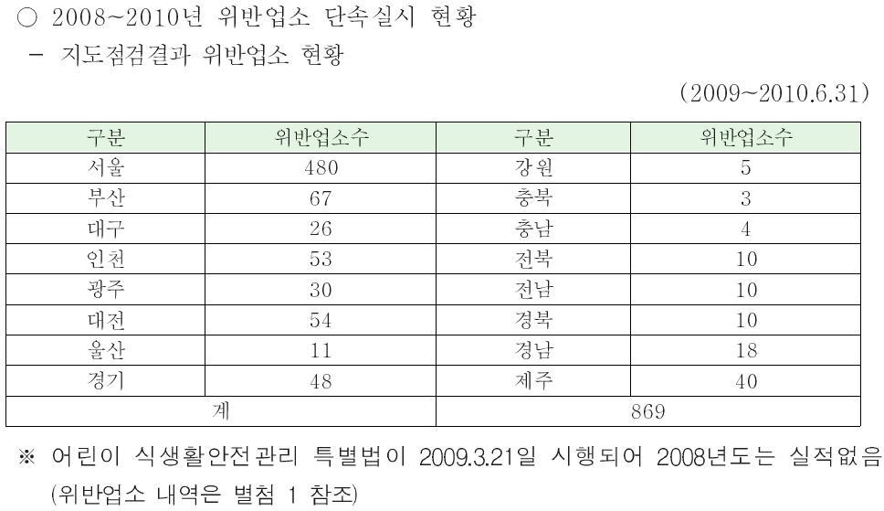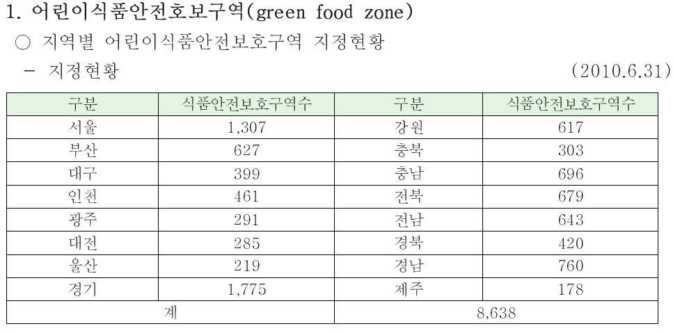 식약청에 지역별 어린이 식품안전 보호구역 지정현황과 단속현황, 우수판매업소 지정 현황에 대해서 정보공개청구해보았습니다. 식양청에서 공개해 준 내용을 보면,