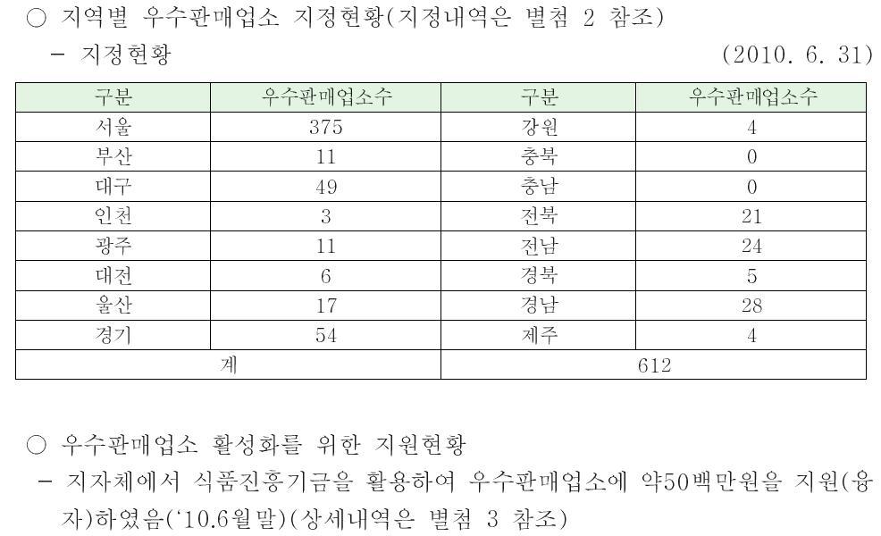 각 지자체에서는 식약청과 함께 어린이 식생활 안전관리특별법을 잘 지켜 어린이들에게 건강한 먹을 거리를 제공한 업소를 지정, 식품진흥기금으로 지원을 하고 있는데요. 서울이 385개 업소로 가장 많았던 반면 충북과 충남은 한 곳도 지정되지 않았네요. 서울은 위반업소도 일등, 우수판매업소도 일등이네요.
