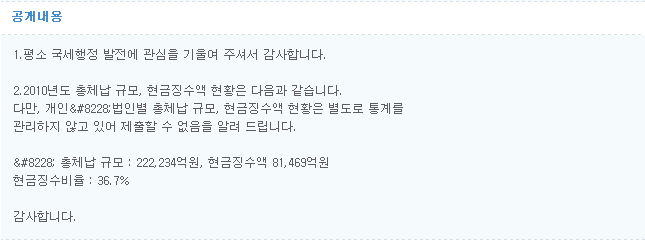 이렇게 세금 체납은 뜨거운 이슈가 되고 있는데요, 그렇다면 지난해 세금 체납의 총 규모는 얼마나 되며 체납의 최근 추이는 어떨까요? 정보공개센터는 국세청에 2010년 세금 체납액 총액에 대해 공개청구를 해봤습니다.
