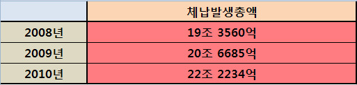 국세청에서 공개한 2010년의 체납액은 22조 2천억원이었습니다. 별다른 분석 없이도 체납 규모가 상당히 크다는 것을 느낄 수 있습니다. 헌데 더 큰 문제는 세금 체납액의 지속적인 증가 경향입니다.