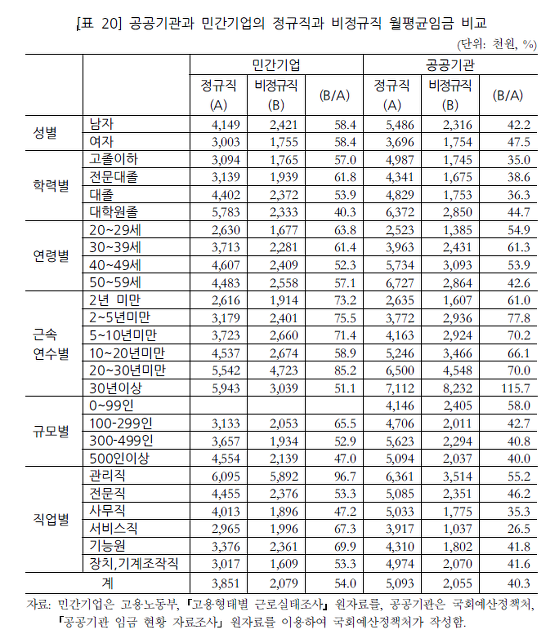 국회예산정책처는 “공공기관 정규직은 퇴직 직전인 58세가 되면 근속연수가 27.4년으로 증가하면서 월평균 임금이 678만원으로 오르지만, 비정규직은 근속연수가 4년에 머물러 225만원에 그친다”며, 이러한 임금격차는 근속기간의 차이가 가장 중요한 요인이라 설명했습니다. 또한 학력, 근속년수 등 속성이 동일한 경우에도 공공기관 비정규직은 정규직에 비해 월평균 97만원(19.1%)을 적게 받아, 민간기업의 정규직과 비정규직 간 순임금격차 11만원(2.8%)에 비해 큰 것으로 나타났습니다.