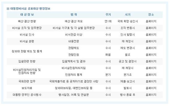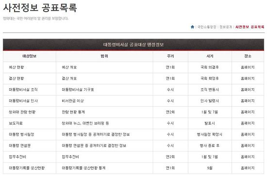 현재 청와대는 공공기관들이 의무적으로 공개해야할 사전정보공표가 잘 이뤄지지 않고 있고 사전공개정보 대상도 노무현 정부보다 축소된 상태입니다.