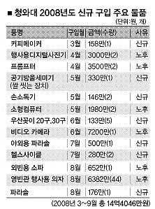 최영희 의원이 올해 3월부터 9월까지 청와대에서 구입한 물품 14억 4046만원 구입 내역을 공개했다. 대당 1500만원 디지털 카메라가 2대, 공기방울 쌀 씻는 기계 330만원, 야외용 파라솔 500만원 1개, 158만원 커피메이커가 들어 있다.