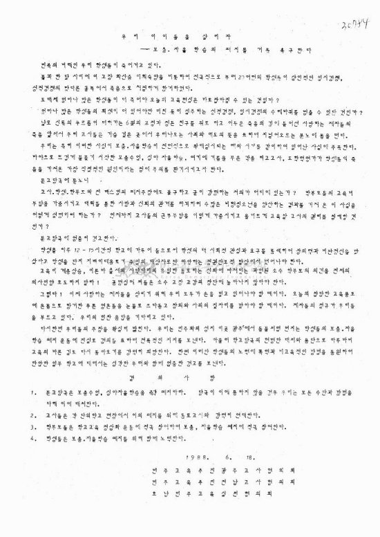 민족의 미래인 우리 학생들이 죽어가고 있다. 불과 한달 사이에 이 고장 화산중 이희숙양을 비롯하여 전국적으로 무려 20여명의 학생들이 살인적인 입시경쟁, 성적경쟁의 막다른 골목에서 죽음으로 처절하게 항거하였다.