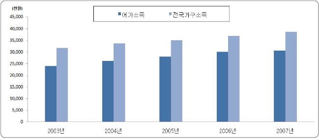 어가소득은 다행히도 가구당 30,668,000원으로 전년대비 2.2%가 증가했습니다. 하지만 이런 소득증가에도 불구하고 농가/어가를 제외한 전국 가구소득과 비교하면 전국가구 소득의 79.2% 수준밖에 미치지 못해 결코 좋은 안정적인 상황이라고 볼 수 없습니다.