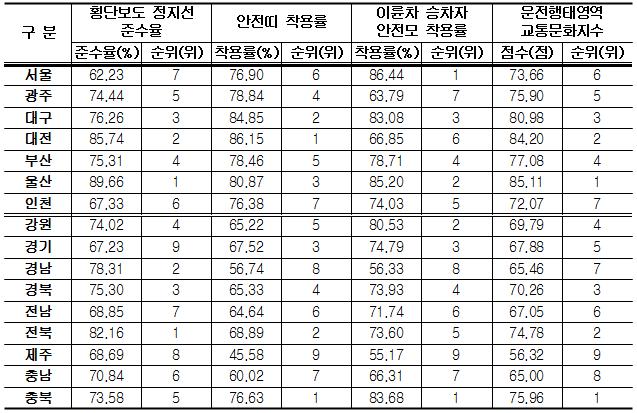 분석결과를 보면 횡단보도 정지선 준수 부분은 울산이 1위, 안전띠 착용에서는 대전이, 오토바이 헬멧 착용부문은 서울이 1위를 했습니다. 종합1위는 울산시네요.