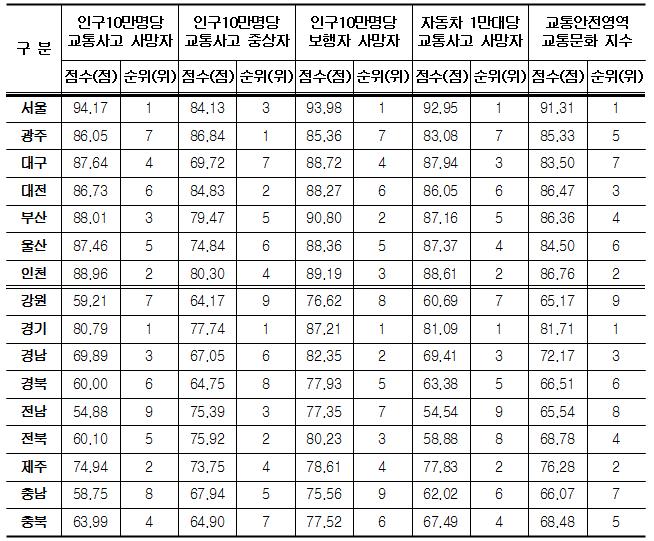 결과를 보면 10만명당 교통사고사망자 수, 10만명당 보행자 사망자 수, 자동차 1만대 당 교통사고 사망자 수 영역에서 서울이 모두 1등을 차지했습니다.