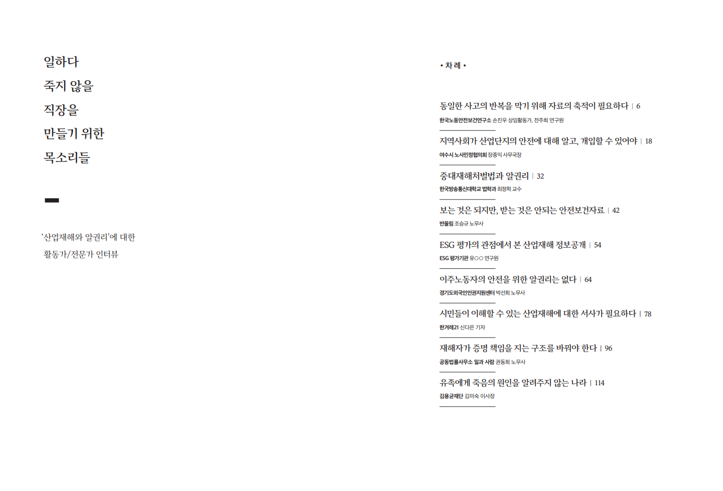 그뿐 아니라 ‘알권리’에 초점을 맞추어 산업재해 문제를 살펴본 인터뷰 작업도 함께 진행했습니다. [일하다 죽지 않을 직장을 만들기 위한 목소리들 : ‘산업재해와 알권리’에 대한 활동가/전문가 인터뷰]입니다. 정보공개센터 활동가들이 여러 활동가와 전문가들을 만나 일터에서 위험요인을 제대로 알기 어려운 문제, 산업재해 피해자들이 산재 인정 절차에서 겪는 장벽들, 산재에 대한 정확한 통계도 알기 어려운 현실, 유가족에게도 알려주지 않는 사고의 진실, 정보접근에서 배제된 이주노동자 등에 대해 이야기를 들은 내용을 정리했습니다.