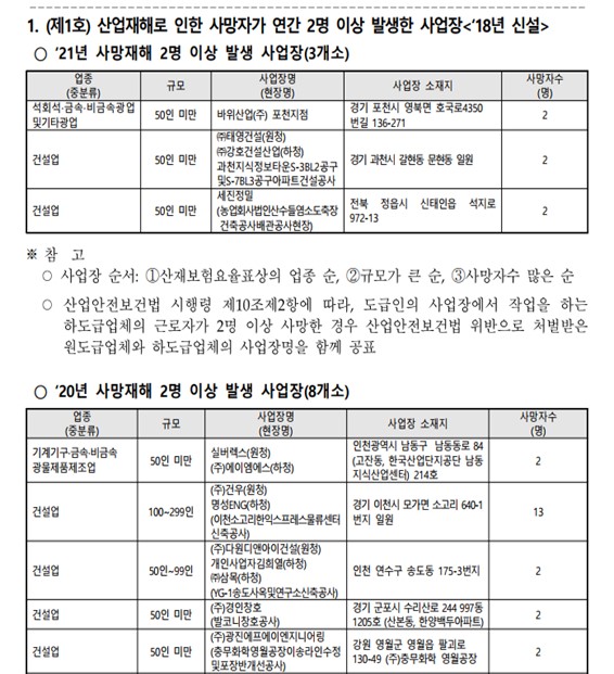 어떤 사업장에서 무슨 사고가 발생했는지 공개하여 “사업주의 명예·신용에 대한 심리적 압박을 통한 산업안전보건법상의 의무이행을 간접적으로 강제”한다는 것이 이러한 제도를 마련하게 된 취지다. 문제는 현재 시행하는 공개 제도의 한계가 너무나 분명하고, 고용노동부 역시 소극적인 태도를 보이고 있다는 점이다.