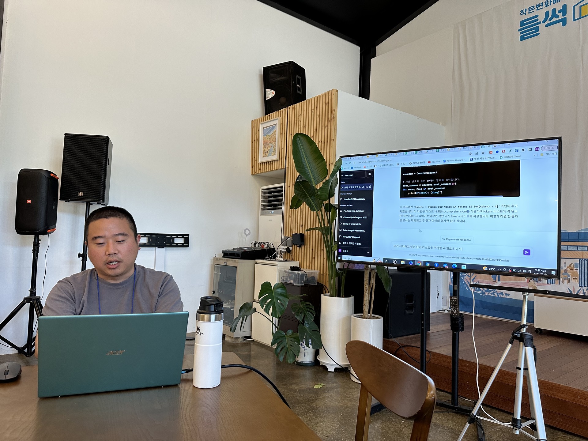 그래서 내 경험이 더욱 떠오른다. 함께하고 싶어지고 공감 간다. 이런… 다들 비슷한 걸까. 문제가 해결됐다. 지방의회 회의록 자연어처리. [함께 만들어가기] 세션이었는데. 7명에서 작당모의 했다. 회의록을 분석하고 챗 GPT로 필요한 파이썬 코드를 작성했다. 문제정의도 코드작성도 하나씩 누가 기여한지 모르는 등산로 돌탑처럼 만들어지는데 그 모습이 재밌어서 한참을 웃었다. 협력도 이야기도 힘이 됐다. 앞으로도 늘 순탄할 것 처럼.