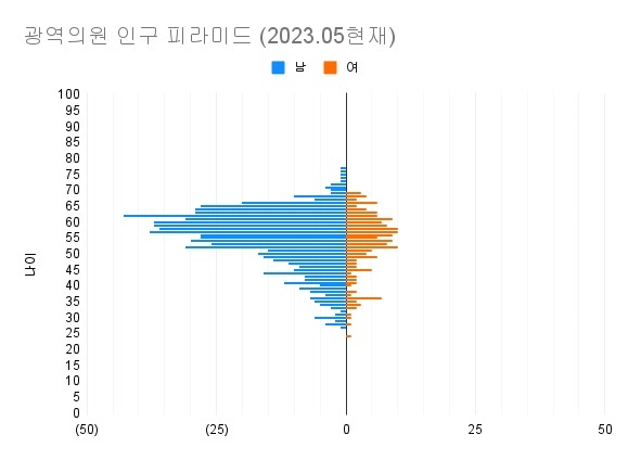 특히 한국 전체의 인구 피라미드와 의원들의 인구 피라미드를 비교해서 살펴보면 의회의 구성이 인구 집단의 특성을 반영하지 못하고 심각하게 편향되어 있다는 것을 확연하게 알 수 있습니다.