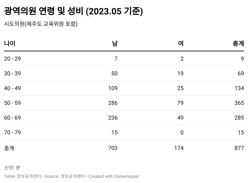시도 광역의원(제주도 교육의원 포함)의 경우 2023년 5월 현재 재직 중인 877명 중 703명이 남성, 174명이 여성으로 남성 의원이 80%에 달했습니다. 구시군 기초의원은 2988명 중 1991명이 남성으로 67%에 해당했습니다.