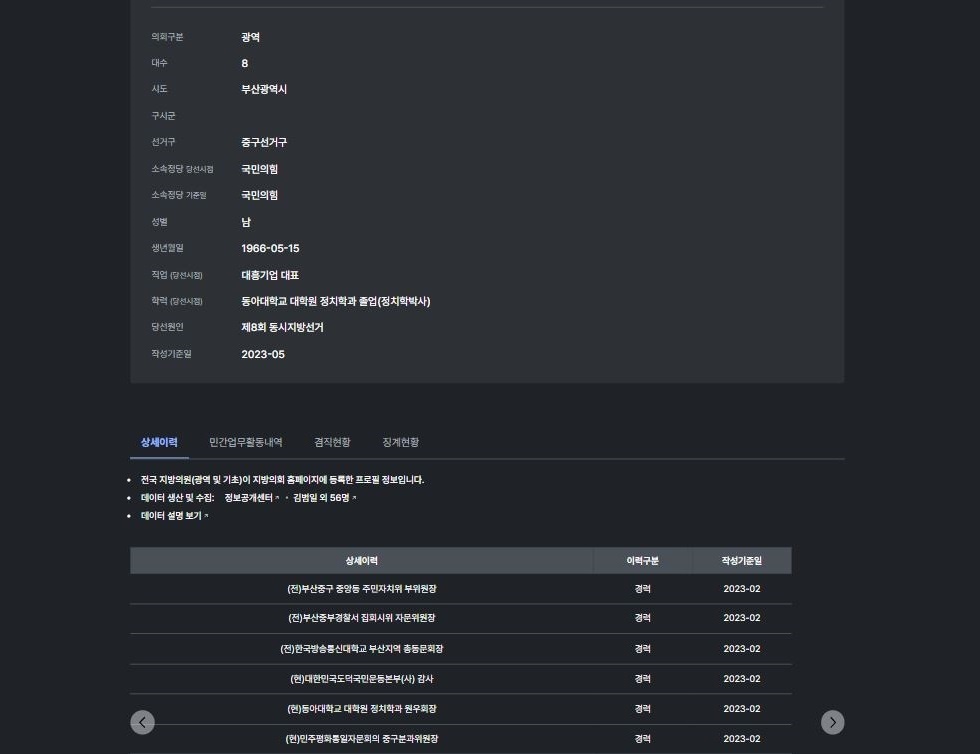 지방의원들의 상세 이력과 민간업무활동내역을 분석하면 정당 이외에도 지역 내 특정 학벌, 종친, 봉사단체 활동 등 지역 정치에 영향을 미치는 다양한 요소들을 함께 살펴볼 수 있습니다. 나아가 토호 세력의 형성이나 공직 수행 시 이해충돌의 가능성을 감시하고 이들이 대표하는 집단이 누구인지 시민들이 직접 판단할 수 있습니다.