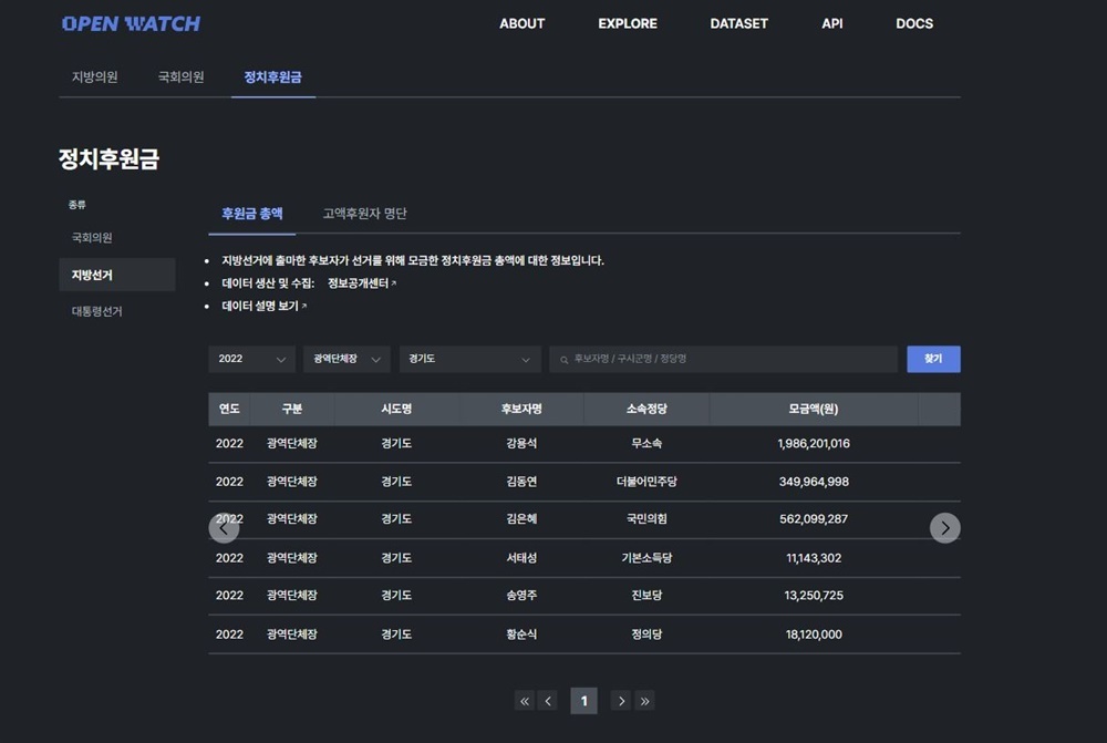 오픈와치는 투명사회를 위한 정보공개센터에서 선거관리위원회에 정보공개청구하여 수집한 2008년~2021년까지 14년 치의 국회의원의 연도별 후원금 모금 총액과 고액후원자 명단, 2012년~2022년까지의 대통령선거 후보자의 후원금 총액 및 고액후원자 명단, 그리고 지난 2022년 제8회동시지방선거 당시 후보자들의 후원금 총액 및 고액후원자 명단을 제공합니다.