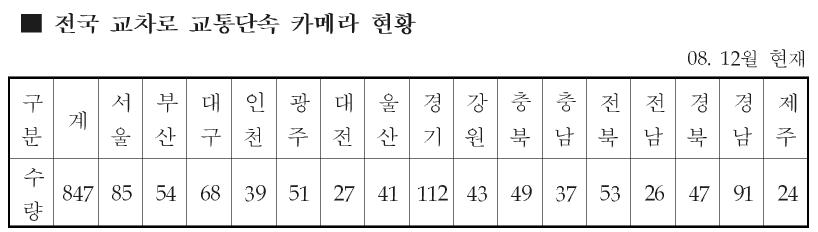 전남은 도 전체를 다해도 26개 뿐입니다. 그리고 인천은 서울 못지않게 넓은 면적과 높은 인구밀도를 보이는 곳인데 교통단속 카메라는 서울의 절반에도 미치지 못합니다.