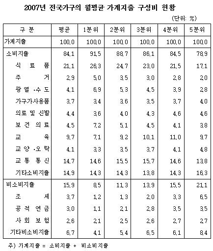 통계청에서 2007년 전국 가구의 소득5분위별 월평균 가계지출 구성비에 대한 자료를 공개했습니다.