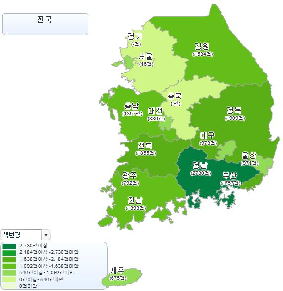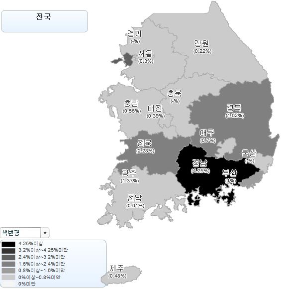 그림에서 가장 진하게 되어있는 곳이 허위장난전화 비율이 가장 높은 곳입니다. 어디인가 보니 경남지역이군요. 전체 재난응급전화의 4.25%가 허위장난 신고전화입니다.