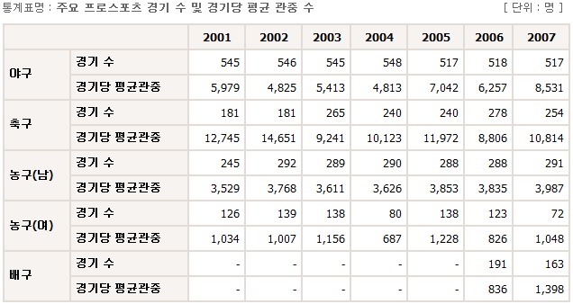경기당 평균 관중 수가 2007년 기준으로 1만여명 정도 되는군요. 그 다음으로는 야구가 8500여명, 남자농구가 4000여명 정도입니다. 여자농구와 배구는 1000여명을 웃돌고 있습니다.