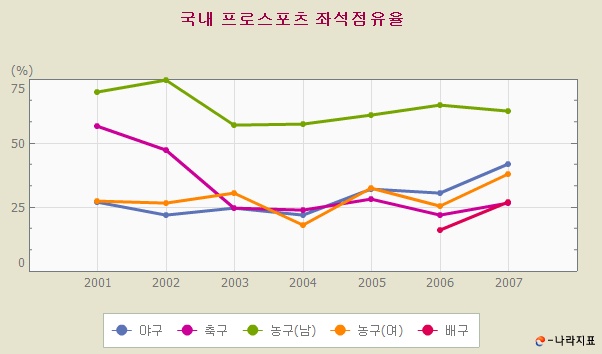 2001년 이래 모두 50% 이상의 좌석 점유율을 보이고 있습니다. 반면 관중 수가 가장 많았던 야구나 축구의 경우에는 좌석점유율이 30%에도 미치지 못하는 해가 많습니다.