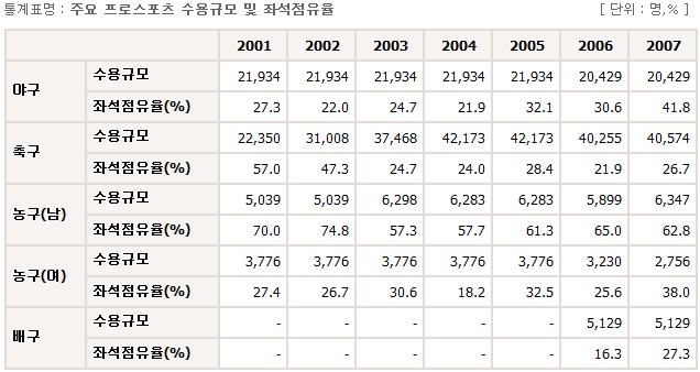 통계청에 따르면 06년의 주요 프로스포츠의 전체관중수는 전년대비 10.5%정도 감소했는데 이 중 툭구가 14.8%, 야구가 1% 감소했다고 합니다.