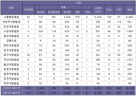 행정소송 처리현황에 대해 정보공개청구를 해 보았는데요. 내용을 보니 법원이 민원인보다 행정기관의 손을 들어주는 경우가 훨씬 많습니다.